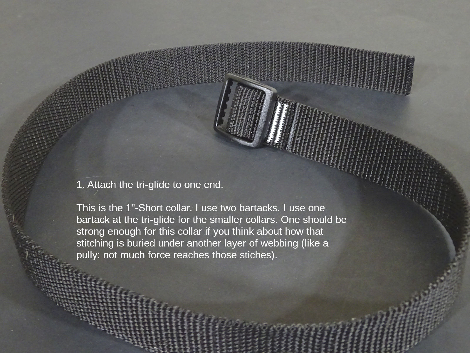For the tri-glide end: two bartacks are probably overkill for even the largest collars. These stitches receive almost no stress (consider how it's buried under another layer of webbing sharing the load, like a pulley. That tack gets half the force. It's also never exposed to external abrasion like the buckle-end stitches.). I start double-tacking the tri-glide with the 5/8"-Long size. I like the added sense of durability, redundancy. But, none of the sizes need two here. Which size to start using two is subjective.