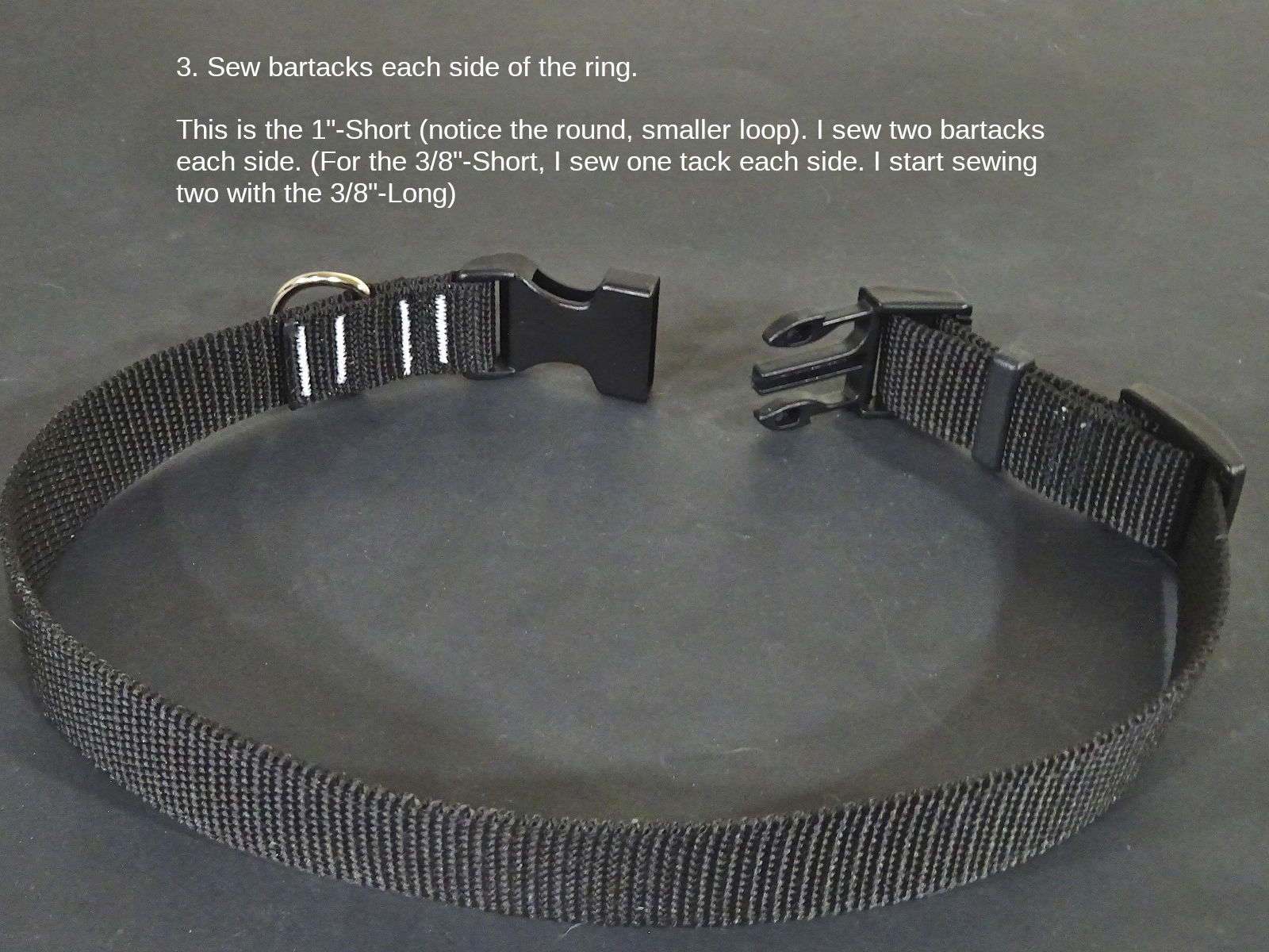 For the male buckle end: I sew two bartacks on each side of the D-ring starting with the 3/8"-Long collar. (For the 3/8"-Short, I sew one tack each side. This collar couldn't fit an animal that pulls much.). It's probably safe to use one tack for all the collars. If either tack failed, the collar wouldn't come apart (the D-ring would still be captive on the collar). These tacks receive more force than the tri-glide tack(s). It makes sense to me to use two. Again, this is arbitrary.