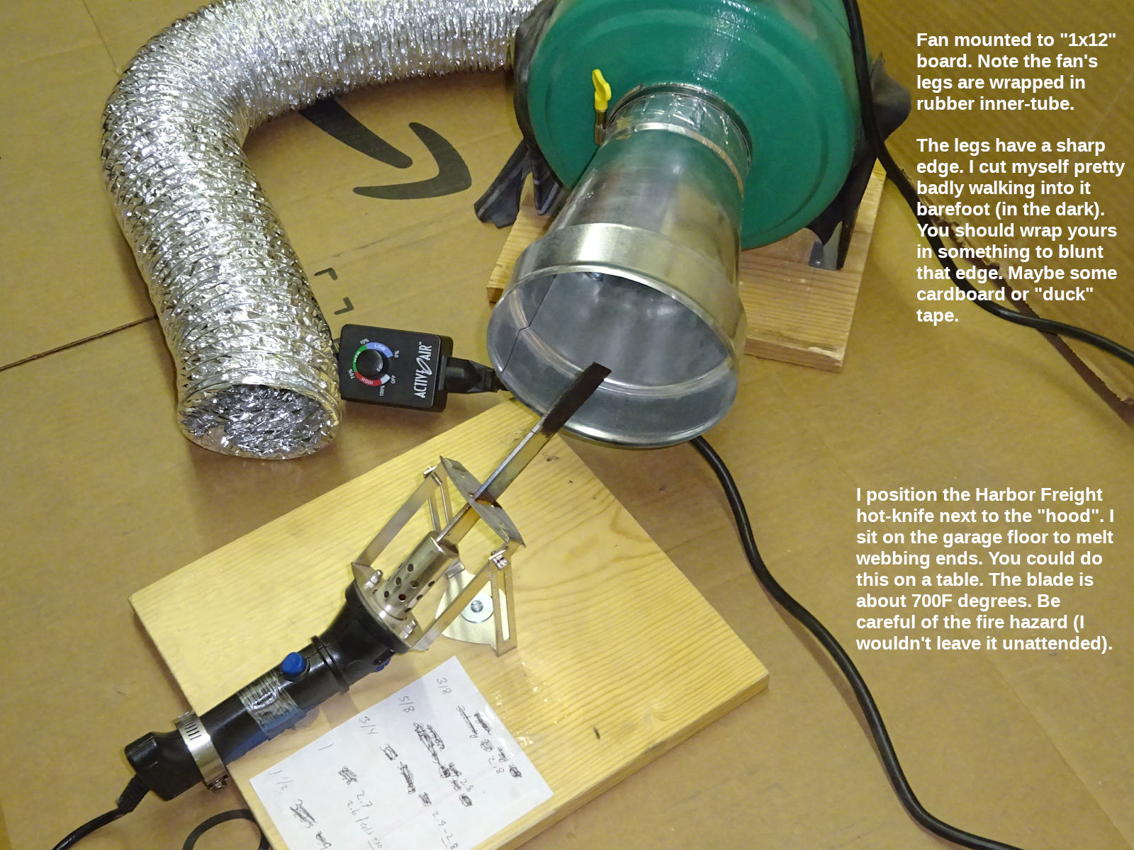 As mentioned, I use a cutting hot-knife (page coming). It cuts & melts at the same time. Prior to that, I used this Harbor Freight hot knife to melt the ends after cuttng with scissors. I mounted it upside-down on a board: