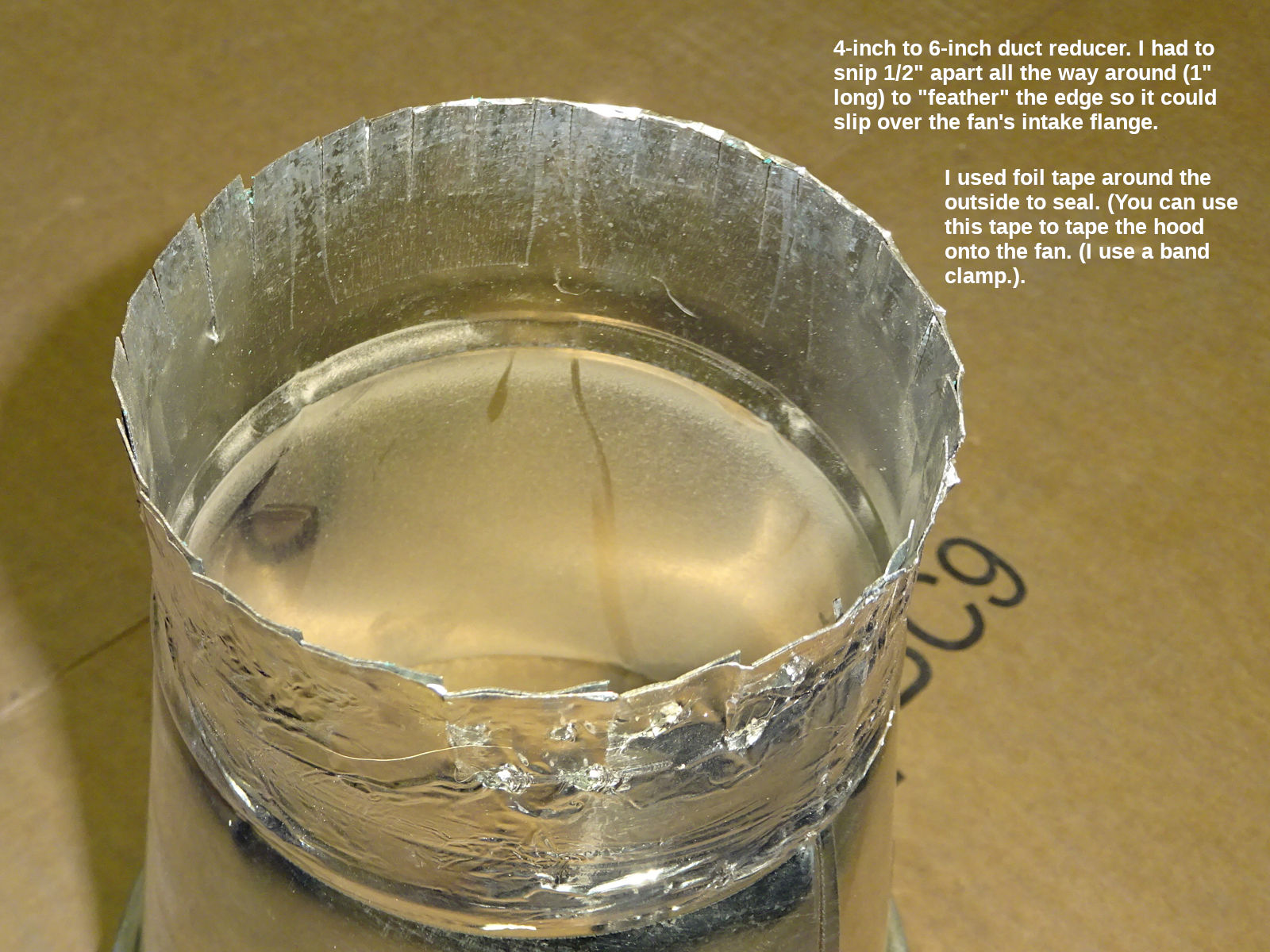 You may not have to do that. I used "foil tape" to seal the outside of my "feathered" end. (You can even tape the hood onto the fan. The prior photo shows using a band clamp.).