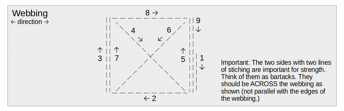 The following table shows how long to cut the webbing & where to mark the ends. Also the number of bartacks: