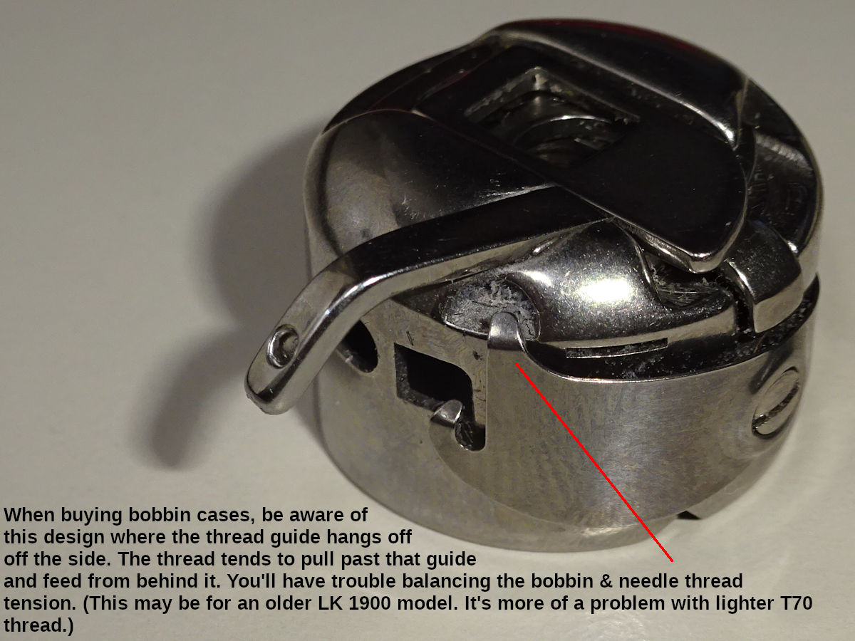 1) The thread should go through the hole in case's arm. I didn't do that for 2 months. It seemed to work ok. (I somehow got the idea the needle went though that hole.). But, it's supposed to hold the thread for the needle and shuttle hook to bring together. I'm surprised how well it worked. I probably missed the first couple stitches and didn't notice it. 2) The tension plate (on the outside of the bobbin case) has two guides which the thread should stay between. If it's not between those guides, the thread tension will be inconsistent. (This was more of a problem with a bobbin case I bought on eBay, below. The tension plate is different, maybe an older design.).