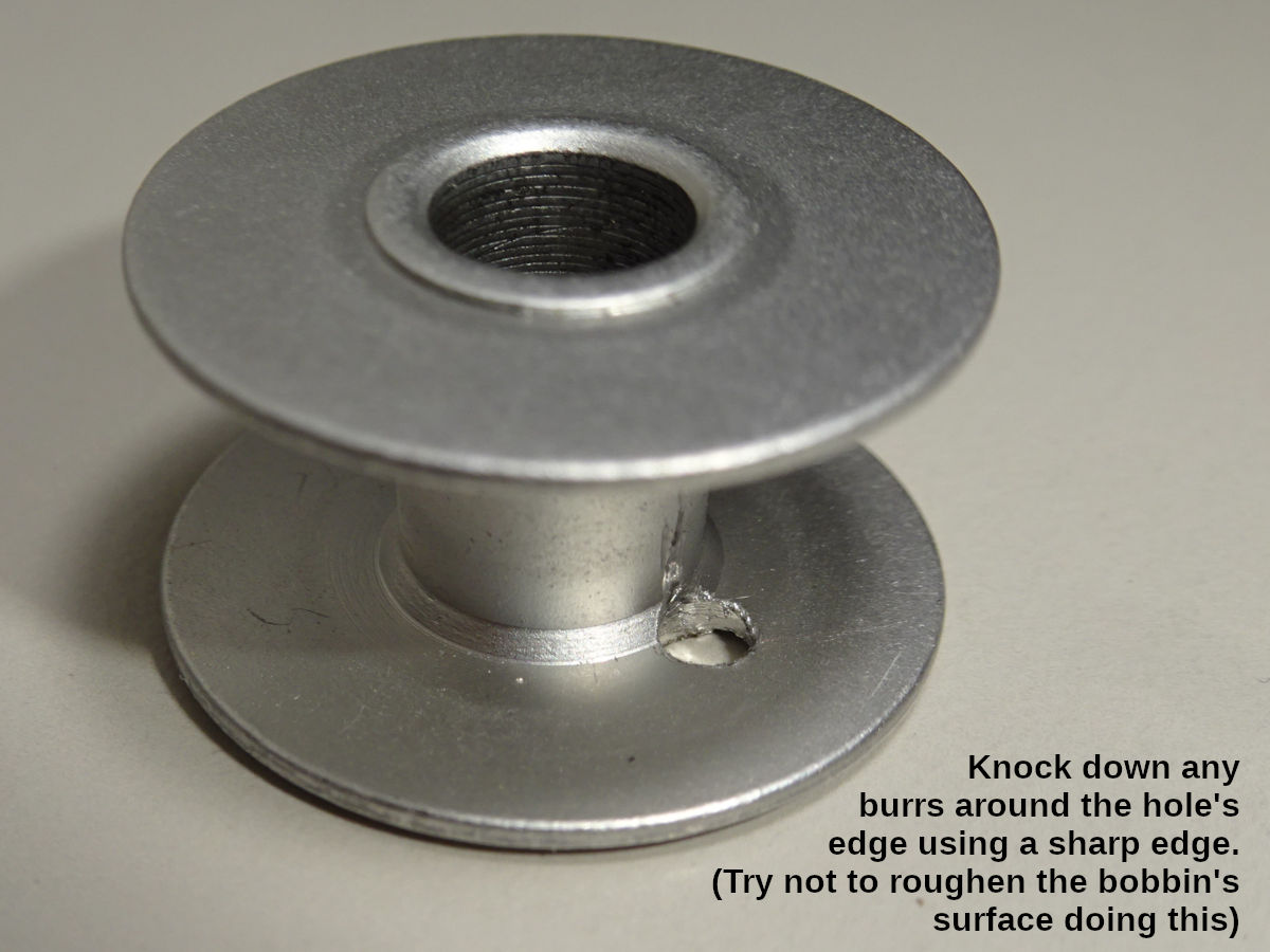 Be sure to smooth any burrs. I used a small flat (or half-curved) steel file. The tip fit into the hole (at an angle from inside the two walls of the bobbin), and I dragged the sharp edge of the file around the edge of the hole, knocking down the sharp edge. The tip of an x-acto blade might work. You want the edge of the hole to not snag the thread interfering with the thread pulling off while sewing. But, you don't want to roughen the inner surface of the bobbin trying to do this. The inner surface should remain as smooth as it is, and you're just taking any snag-potential off the edge of the drilled hole. It's a little hard to do. You need something with hard, square edge you can get into the hole from inside the bobbin, and drag that sharp square edge around the hole's edge to knock down the burrs.