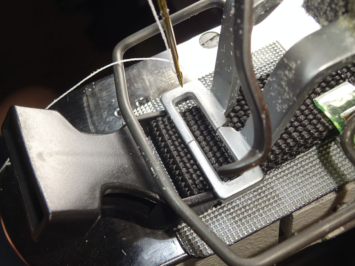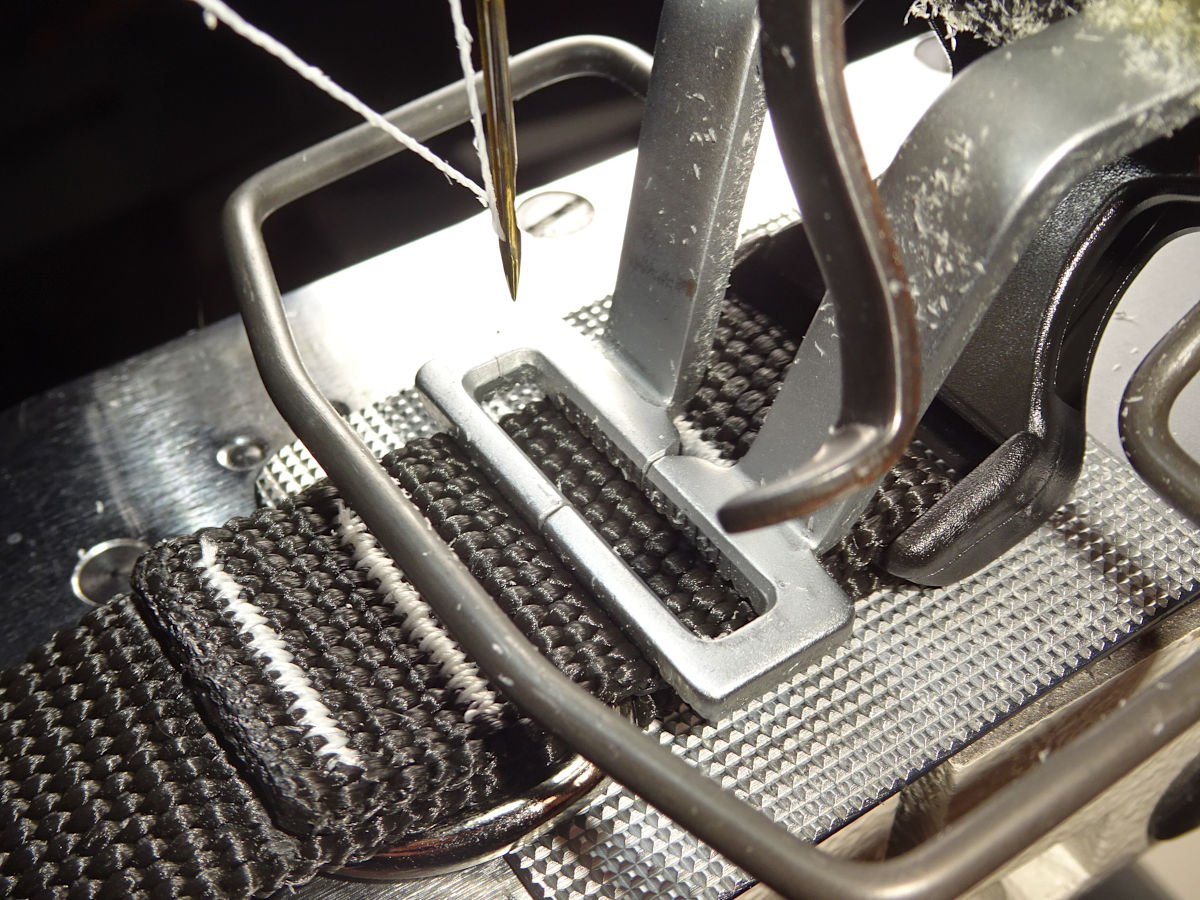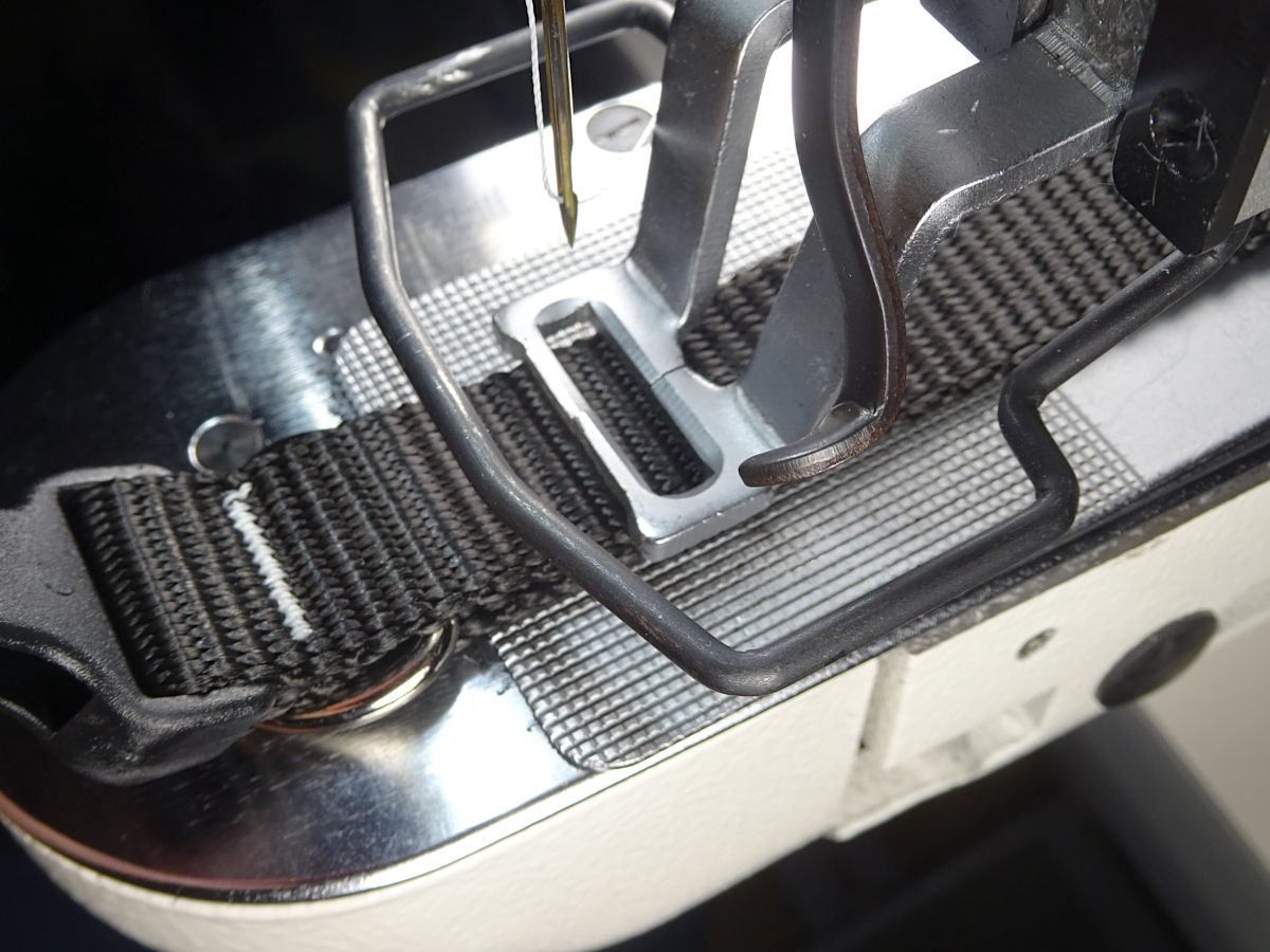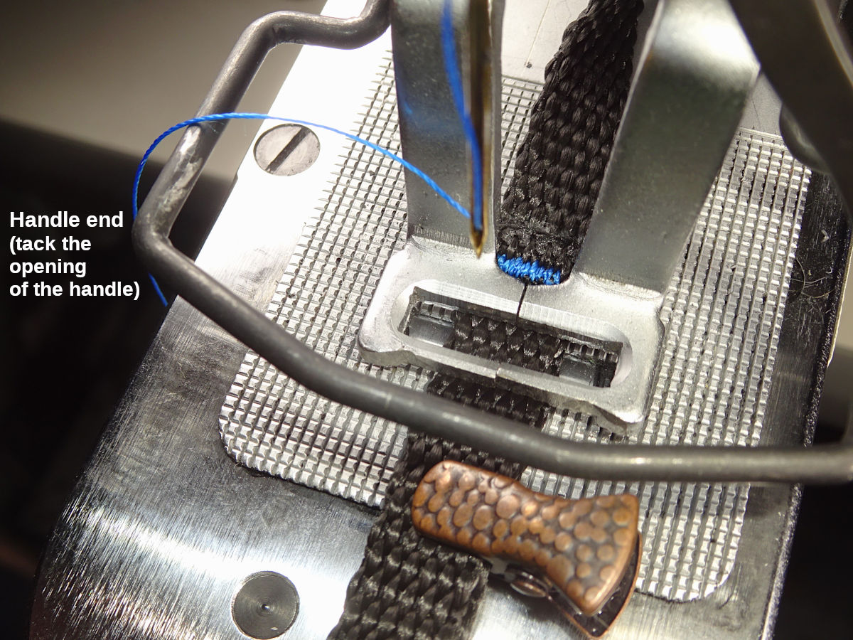 2) When sewing the buckle end: the weight of the opposite end is more of an issue. Don't let it hang off the edge of the table. That weight will amplify the vibration. Always make sure that end lays on the table. (But, when you sew one of the D-ring tacks, the oposite end end will point toward you. You want to hold it in a way that creates some slack between you and the clamp (The clamp should be able to swing side to side without any pulling at it.). For the other tacks on this end, the webbing points to the rear like it did for the tri-glide. Similar to sewing the tri-GLIDE end, you may find that lightly suspending it so it can move with the arch like it's floating in air is best. Or, helping it stay put by pinching down onto the plate, or even the screw head more firmly.