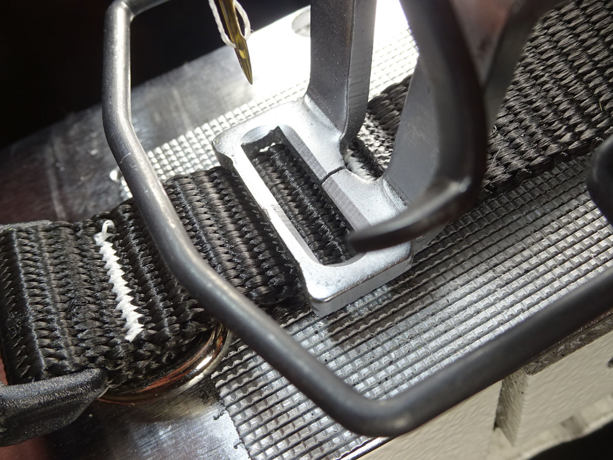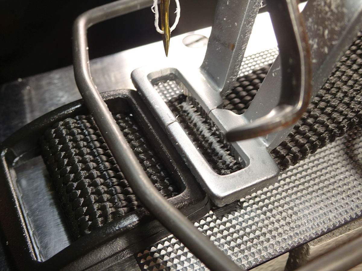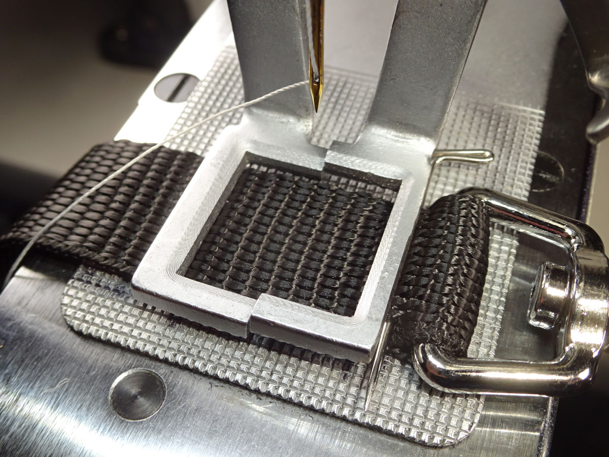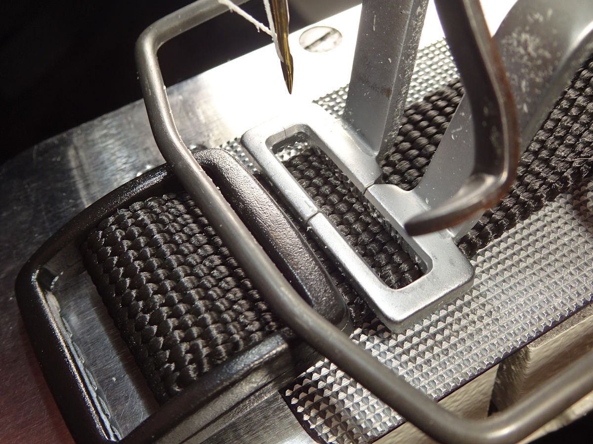 2) When sewing the buckle end: the weight of the opposite end is more of an issue. Don't let it hang off the edge of the table. That weight will amplify the vibration. Always make sure that end lays on the table. (But, when you sew one of the D-ring tacks, the oposite end end will point toward you. You want to hold it in a way that creates some slack between you and the clamp (The clamp should be able to swing side to side without any pulling at it.). For the other tacks on this end, the webbing points to the rear like it did for the tri-glide. Similar to sewing the tri-GLIDE end, you may find that lightly suspending it so it can move with the arch like it's floating in air is best. Or, helping it stay put by pinching down onto the plate, or even the screw head more firmly.