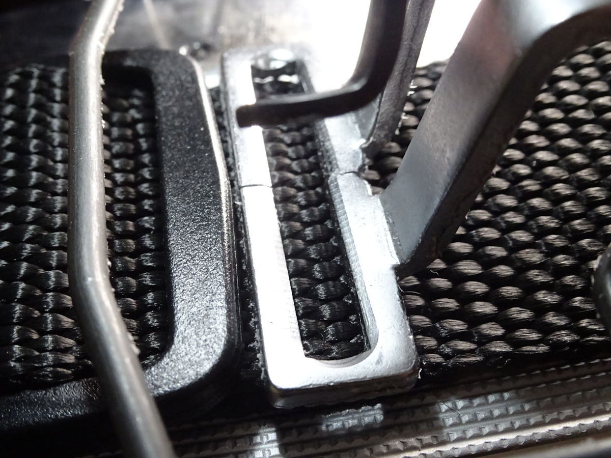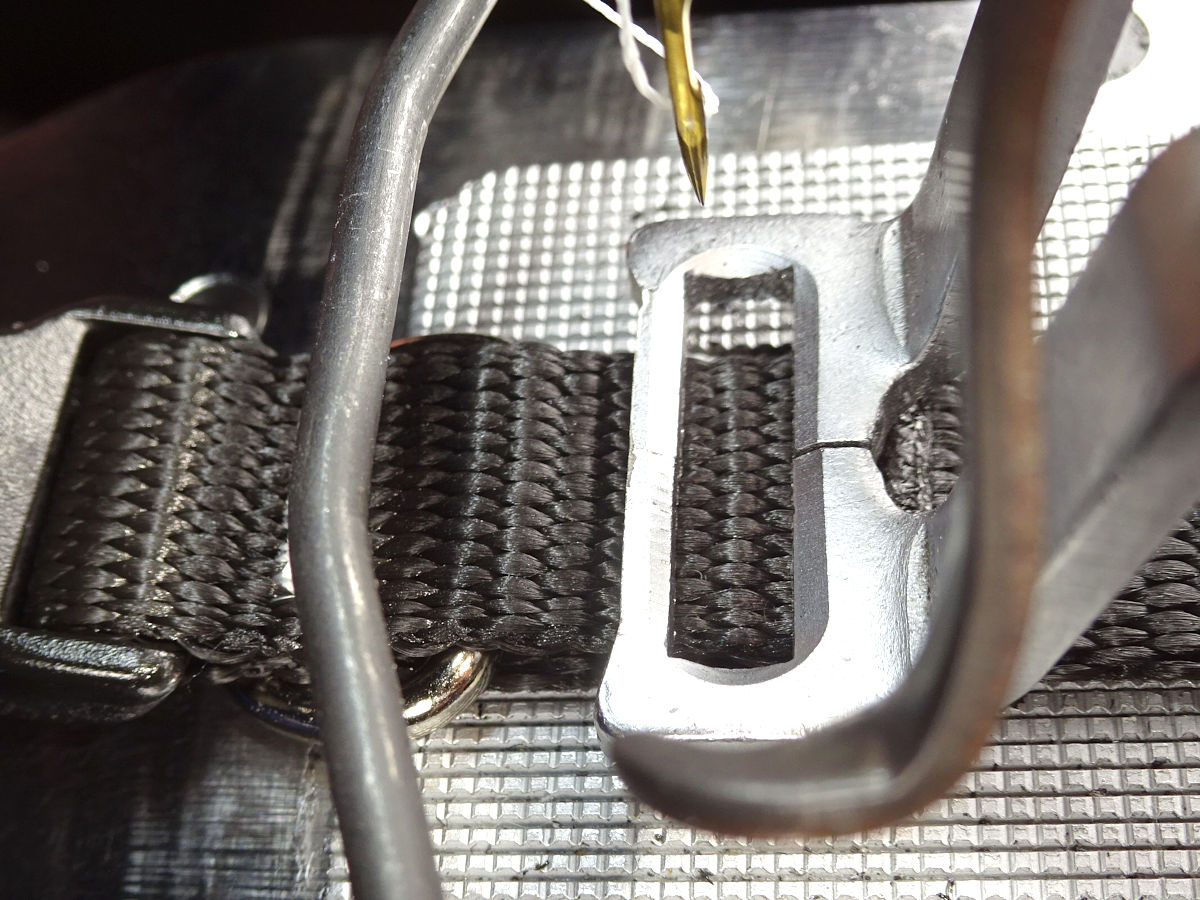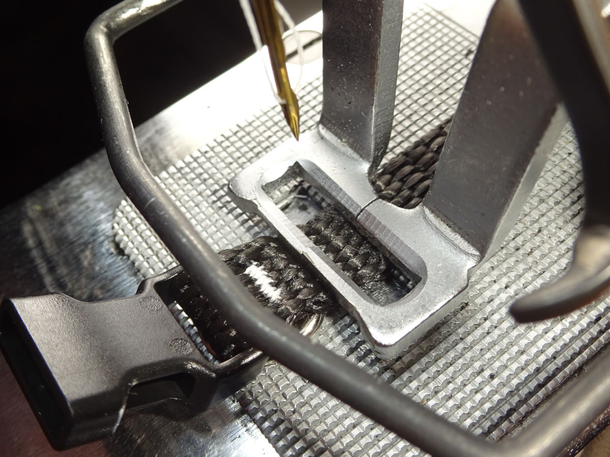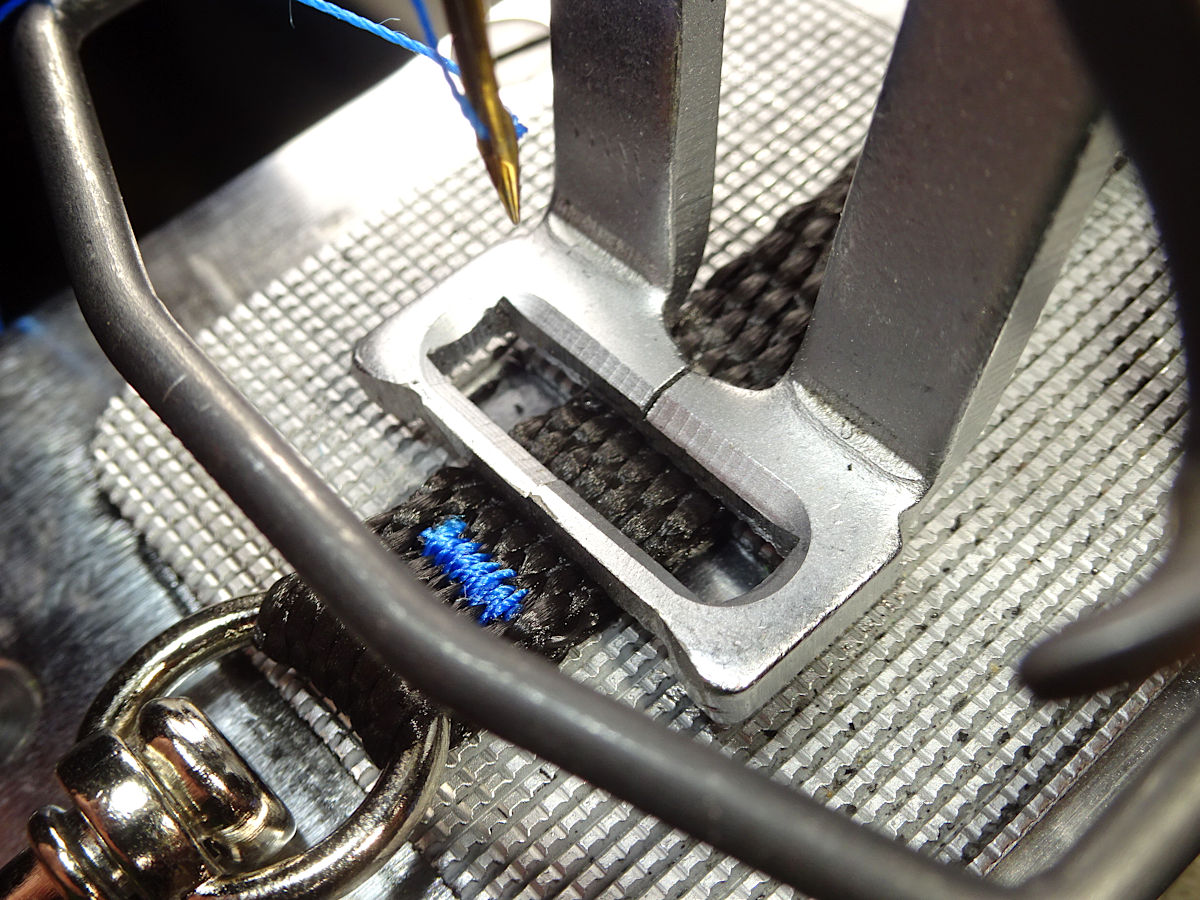 2) When sewing the buckle end: the weight of the opposite end is more of an issue. Don't let it hang off the edge of the table. That weight will amplify the vibration. Always make sure that end lays on the table. (But, when you sew one of the D-ring tacks, the oposite end end will point toward you. You want to hold it in a way that creates some slack between you and the clamp (The clamp should be able to swing side to side without any pulling at it.). For the other tacks on this end, the webbing points to the rear like it did for the tri-glide. Similar to sewing the tri-GLIDE end, you may find that lightly suspending it so it can move with the arch like it's floating in air is best. Or, helping it stay put by pinching down onto the plate, or even the screw head more firmly.