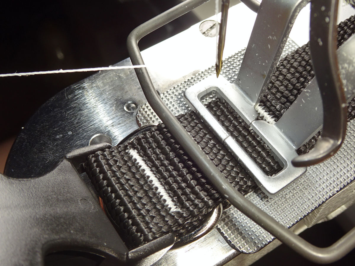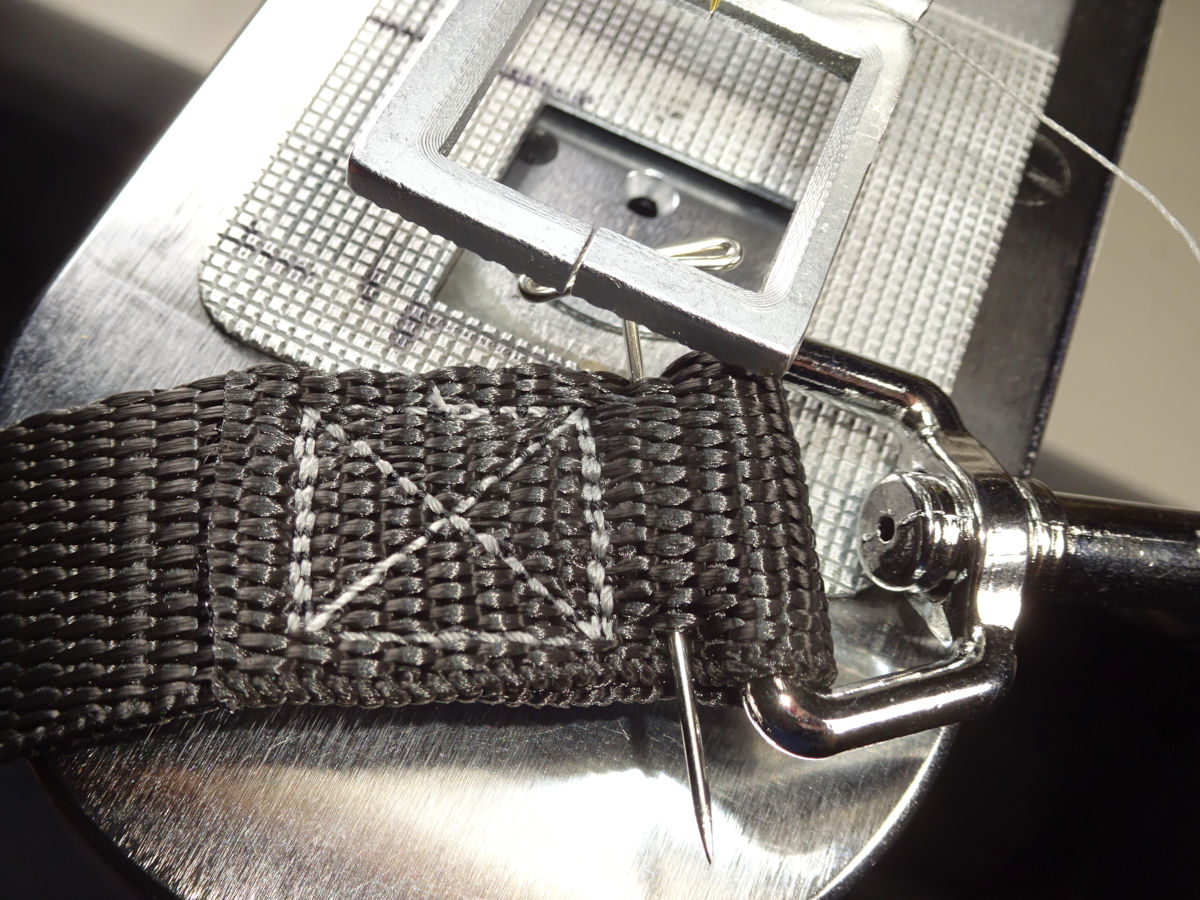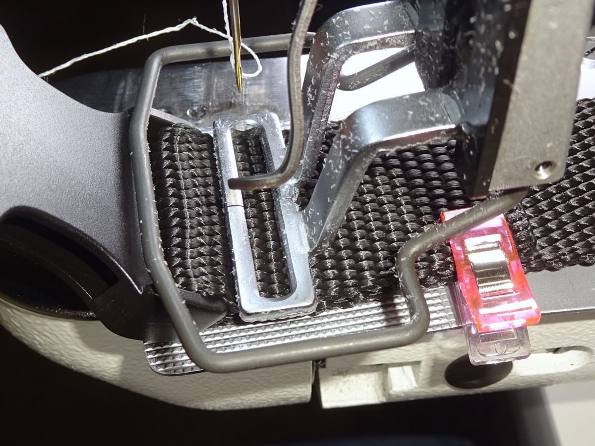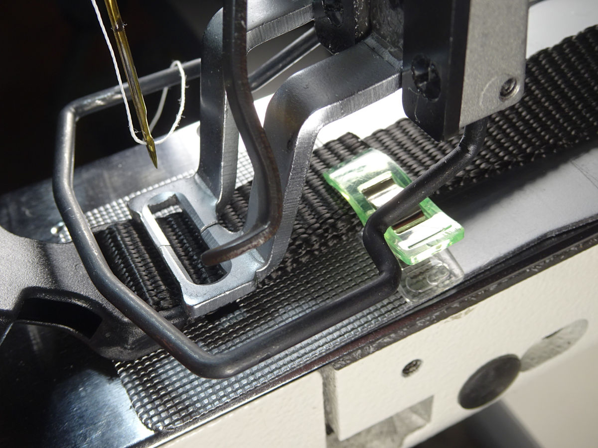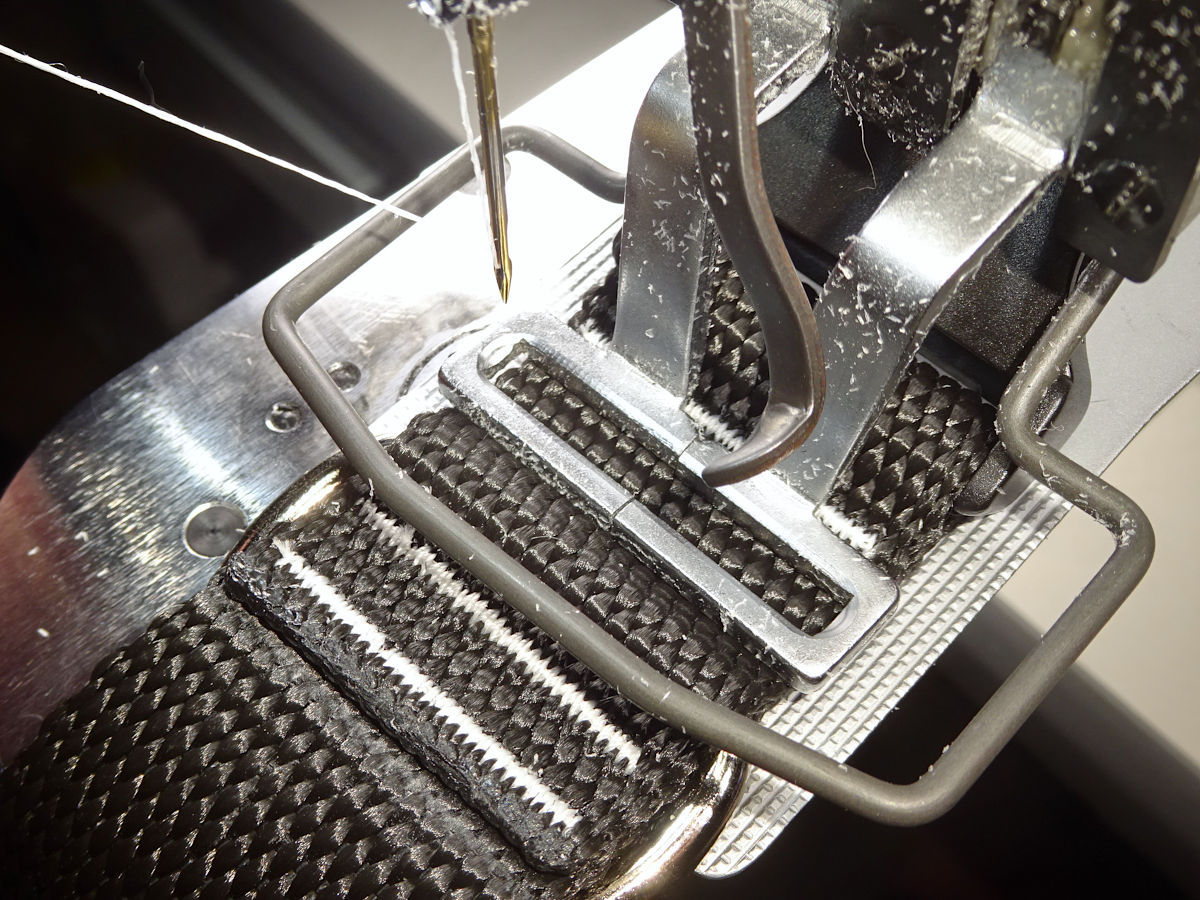 This uses the clamp & plate the machine came with. The photos are in the order of operations: 1) Tack the tail of the triglide end. 2) Tack next to the triglide (you can see the tail tack. Remember: I clamp onto the triglide itself. This is not a good way to start, may not even be worth doing at all. You can add 1/4" to the cut length of webbing, and use that here to clamp down onto the webbing for both tacks). 3) At the other end, tack closest to the buckle, then 4) the tail, 5) tail-side of the D-ring, 6) the other side of the D-ring (closest to the buckle tack):