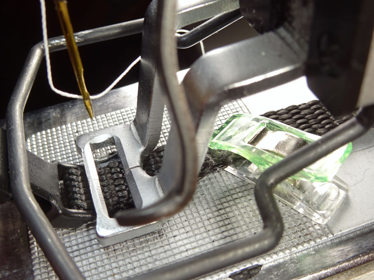 It's challenging to get this lined up. You have to pay attention to three things. I clamp-down once (and release) to flatten the webbing. 1) Position left/right using a mark from a Sharpie pen as a reference: