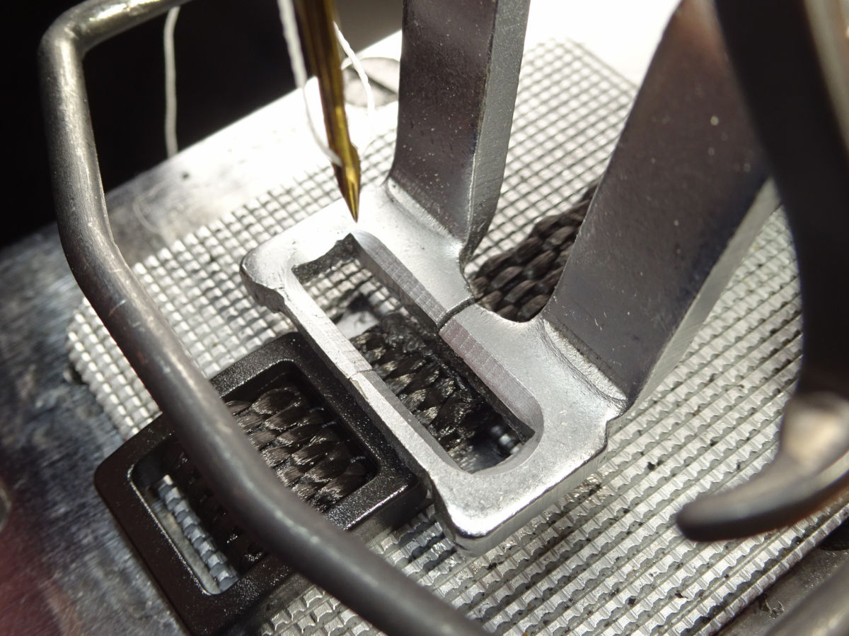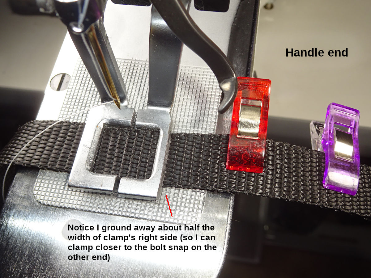 That last point (about clamping too close to the buckle or ring) caused me to grind some of the face off the 3/4" clamp (seen below). I'm tempted to do that with this 1-1/2" (40mm) clamp too. If it was half as thick in the front, I could sew a little closer to the buckle and ring. A tiny amount, but I feel like it could be better. The clamps I bought were inexpensive. It wouldn't hurt to try it. (I wouldn't do this with the 1" clamp the machine comes with. Original Juki parts are expensive.).