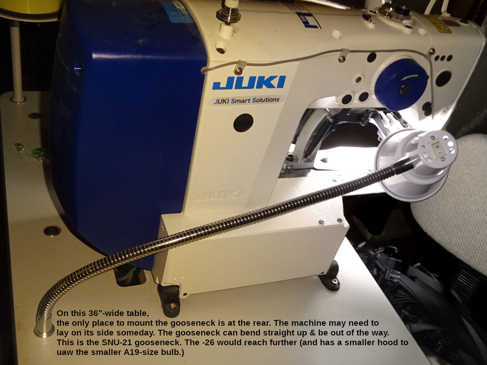 You'll want more lighting than the machine's built-in light. You can buy gooseneck lamps that clamp onto the table, or you drill a hole & install permanently. There is a common design used with industrial machines (google industrial sewing machine lamps. You'll see lots of setups with these lights). They seem to be called SNU-21, or SNU-26 referring to the length of the gooseneck. But, the 21 has a larger hood (6-1/2" long, 4" inside diameter at the opening) and can use a larger A21-size bulb. (Being shorter length, it can hold more weight? The SNU-26 has a smaller hood - 5-3/4" long, 3-3/4" ID - and uses the smaller A19 bulb.). IMPORTANT: if you use the larger A21 bulb in the SNU-26's smaller hood, it will protrude & be glaring to your eyes.