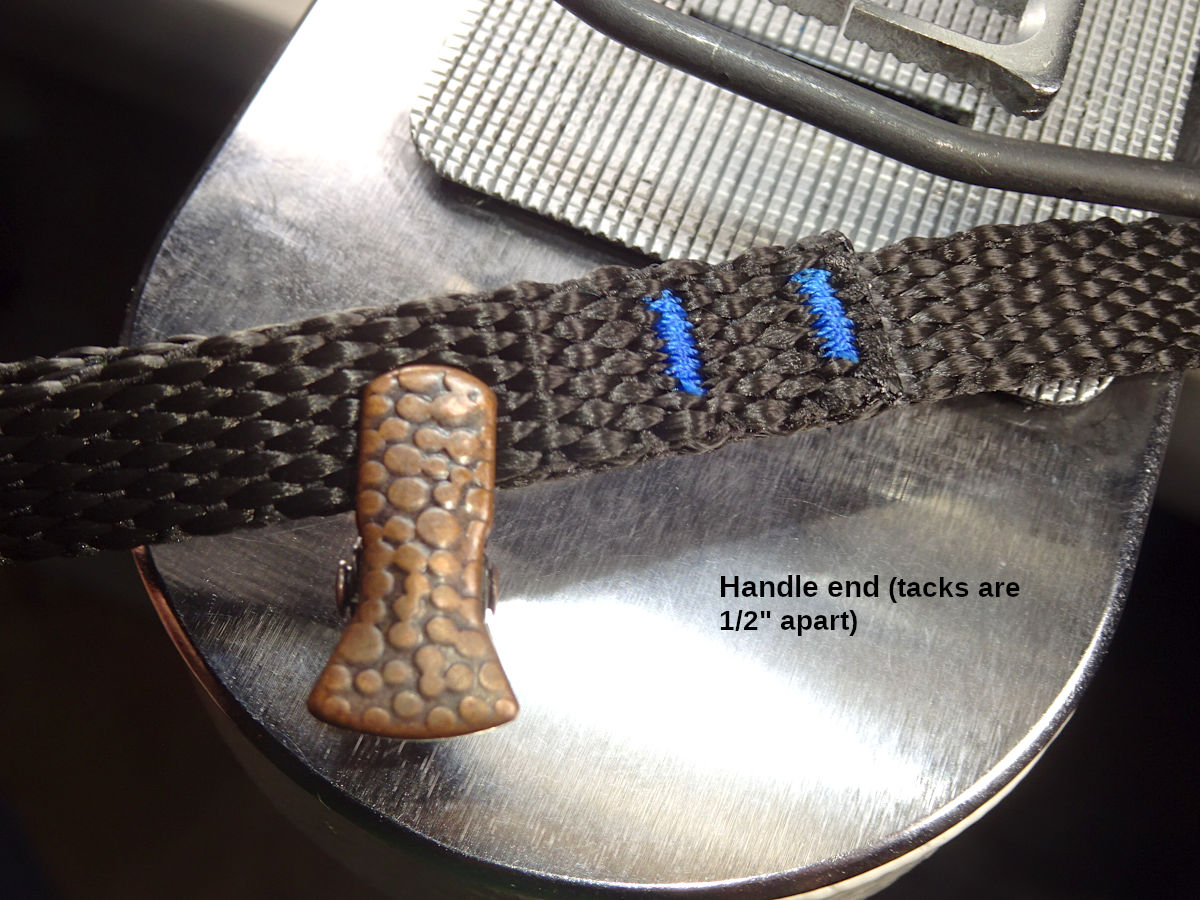 Note: My choice to start using 2 tacks at the tri-glide with the 5/8"-Long was completely arbitrary. I've mentioned elsewhere that two tacks is probably overkill even for the 1-1/2" collars. Almost no force reaches those stitches. (Think of how the webbing loops through the tri-glide. That's like a pulley. There's much less force reaching those stitches than at the D-ring stitches.). I like the security (redundancy) of two tacks. I can't see myself doing just one tack with the 1-1/2" tri-glide. Even though I'm sure it's strong enough, I'd feel better with two there. Then it turns into "where is it obviously over-kill?" I chose 5/8"-Long. You could easily decide that it (and 3/4"-Short) are overkill with two tacks.