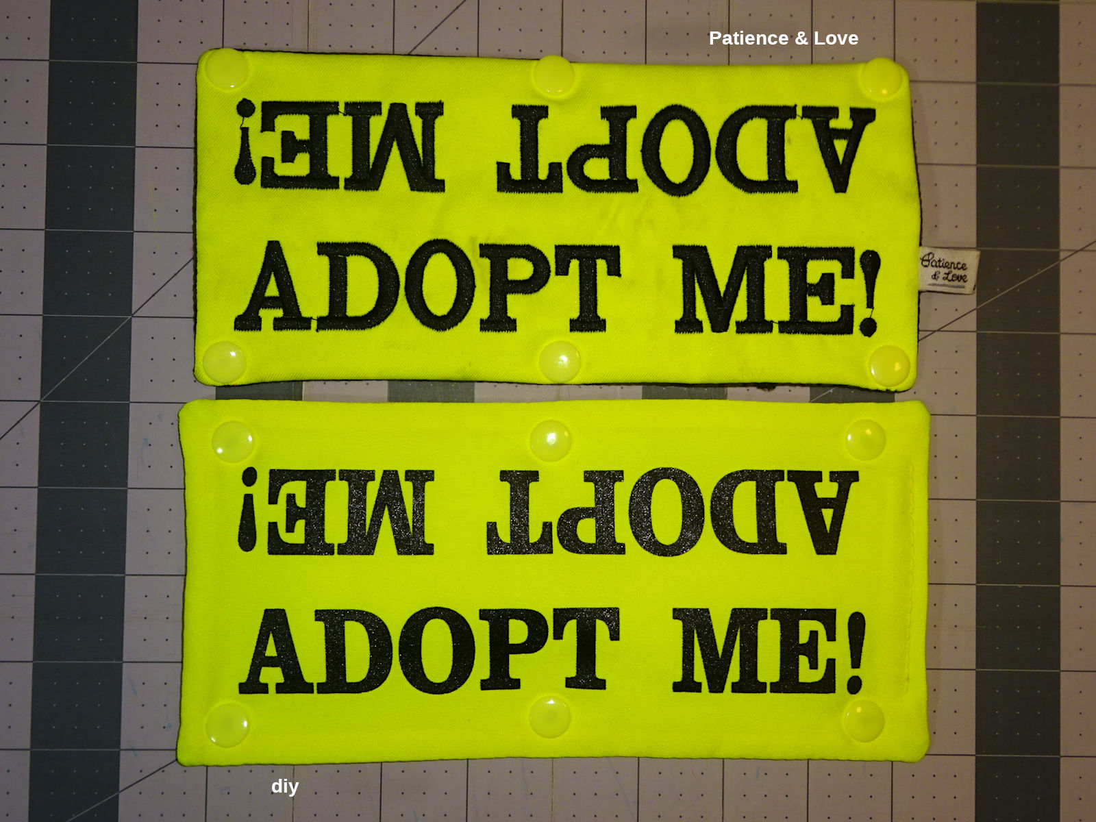 [1] I was inspired to make my leash sleeves by Patience & Love. They're very good quality, embroidered. If you browse their sleeves, you'll see an "Adopt Me!" The dimensions of the one I have: