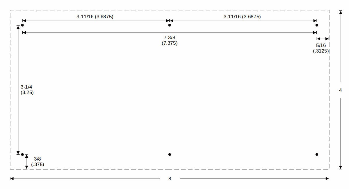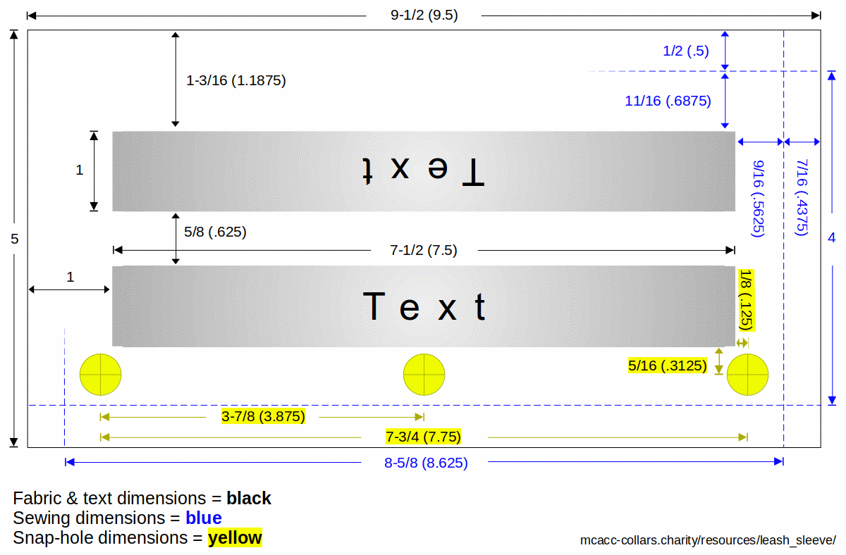 Note: Those paper dimensions are an example of how I shrank my artwork ~4% for printing. The x (horizontal) distance between corner snaps is 7-3/8". The quick-ref dimension is 7-3/4 (3/8 (.375)" longer). But, my y (vertical) distance between snaps remains 3-1/4" (the same as the quick-ref dimension. I kept the y dimension for the snap holes because I want the same fit around the leash.).
