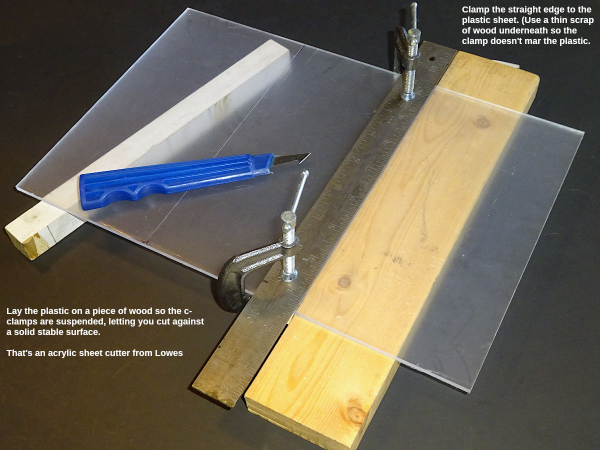 Use something underneath the plastic so the c-clamp's foot won't mar the plastic. (I used a thin piece of wood, like a shim or tongue-depressor.). Then set the plastic on a piece of wood so the c-clamps are suspended freely. You want a solid, sturdy surface to cut against.