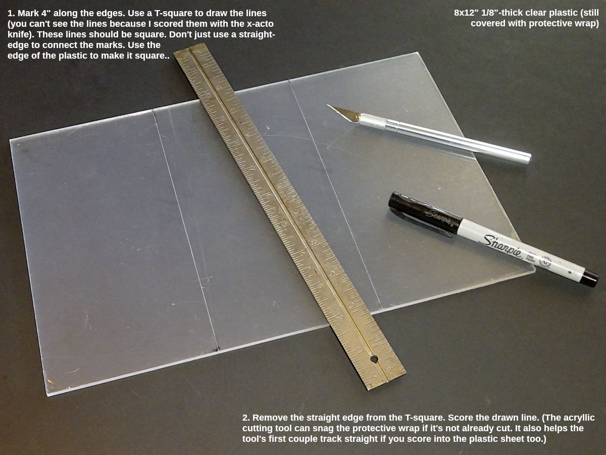 First mark the plastic using a fine-point Sharpie pen (a traditional Sharpie's point is too thick to be accurate for this). Mark the 4" locations along the edge (to get a 4 x 8" piece). Use a T-square to draw the line across the plastic. (It's very important that the cut piece be square. Don't just lay the straight edge across the plastic from mark to mark. Use the t-square against one edge. If the line doesn't perfectly align with the marks you made on the edges, split the difference. It's less important to be exactly 4 x 8" than it is to be square.)
