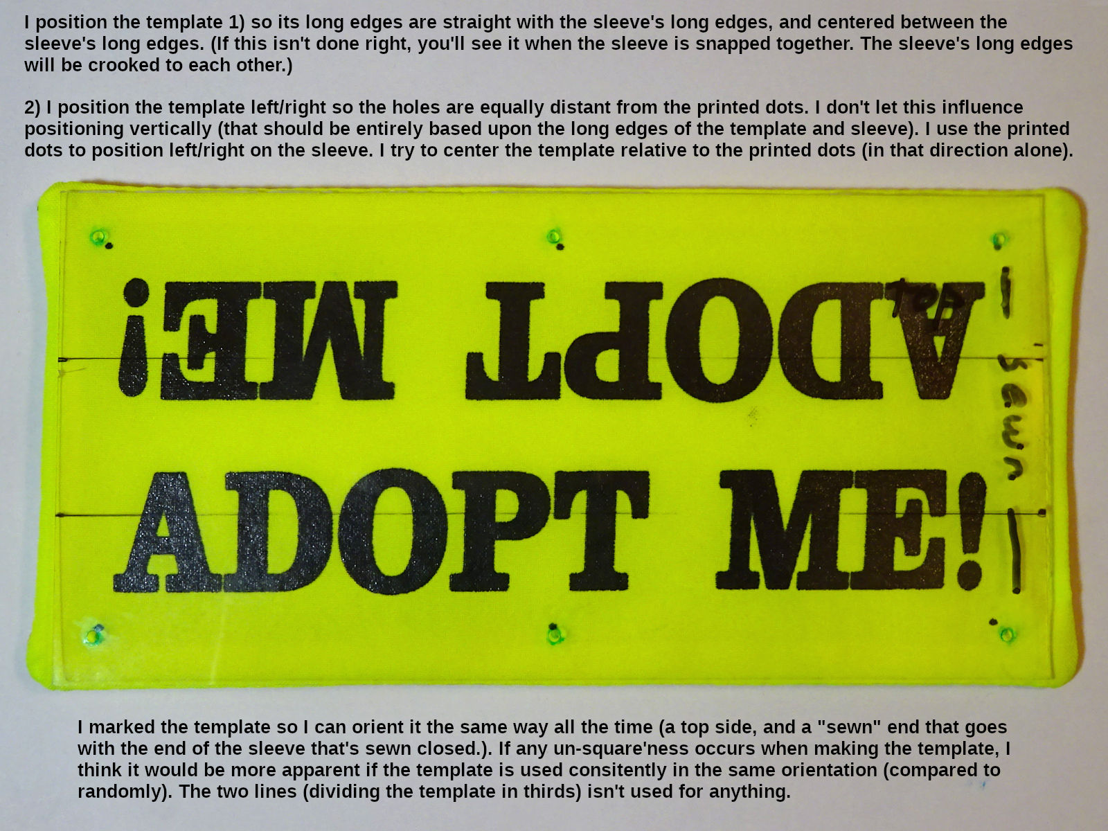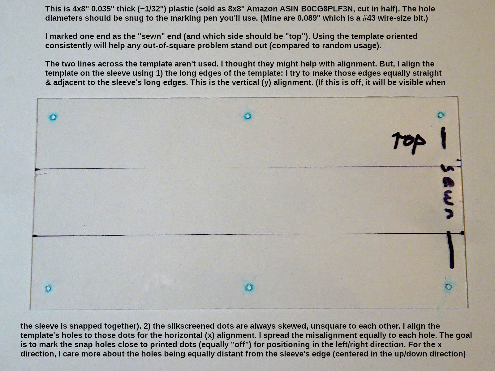 The silkscreen artwork has dots where the holes should be pierced. But, silkscreening & sewing can shift the fabric. To the extent the printed dots aren't square, the sleeve will be puckered when snapped together. I made a plastic "template" with the snap-hole locations drilled through: