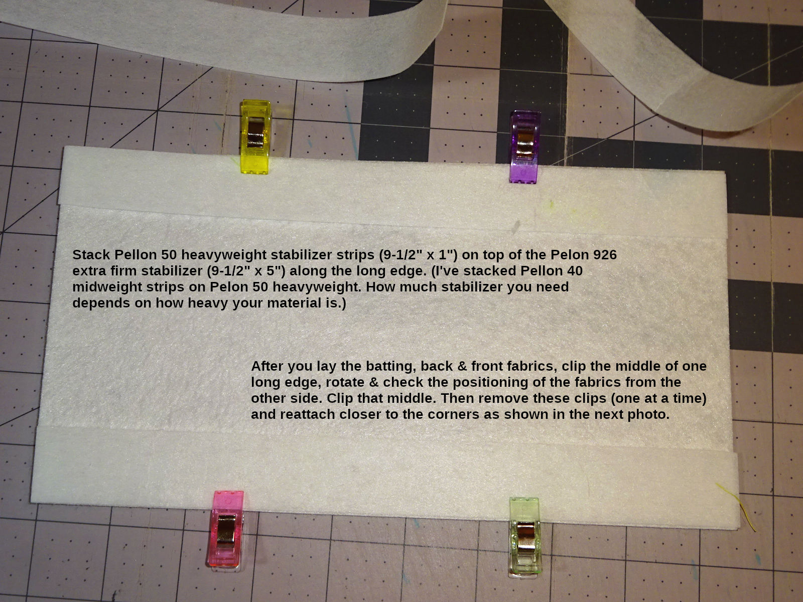 There's also Pellon 40 (midweight). It's very thin. If your fabric is heavier like denim or canvas, then you might use Pellon 50 instead of 926. And then you could use Pellon 40 for the 1" edge strips. Or, if you use heavier or loftier batting, you might make the edge strips out of this midweight stabilizer.
