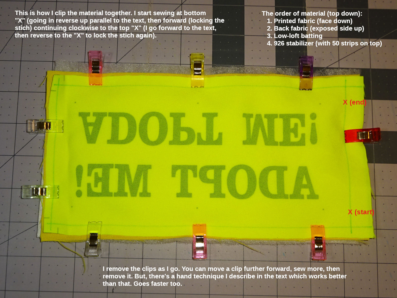 I lay the batting on top of that, then the rear fabric (unfinished side up) on top of the batting, and the front fabric on top of that (printed side down). I position the materials so the stitching will be evenly around the edge of all the material. I clip the center of the long-edge facing me; rotate the material 180 degrees & check the positioning from that side. (I clip that center, then proceed to re-apply the first four clips. Check the positioning again. Then flat-palm the material & re-apply the long-edge clips to take the slack out of the material - make it "taught" as described in the sewing machine section above. Finally, I apply the short-edge clips.):