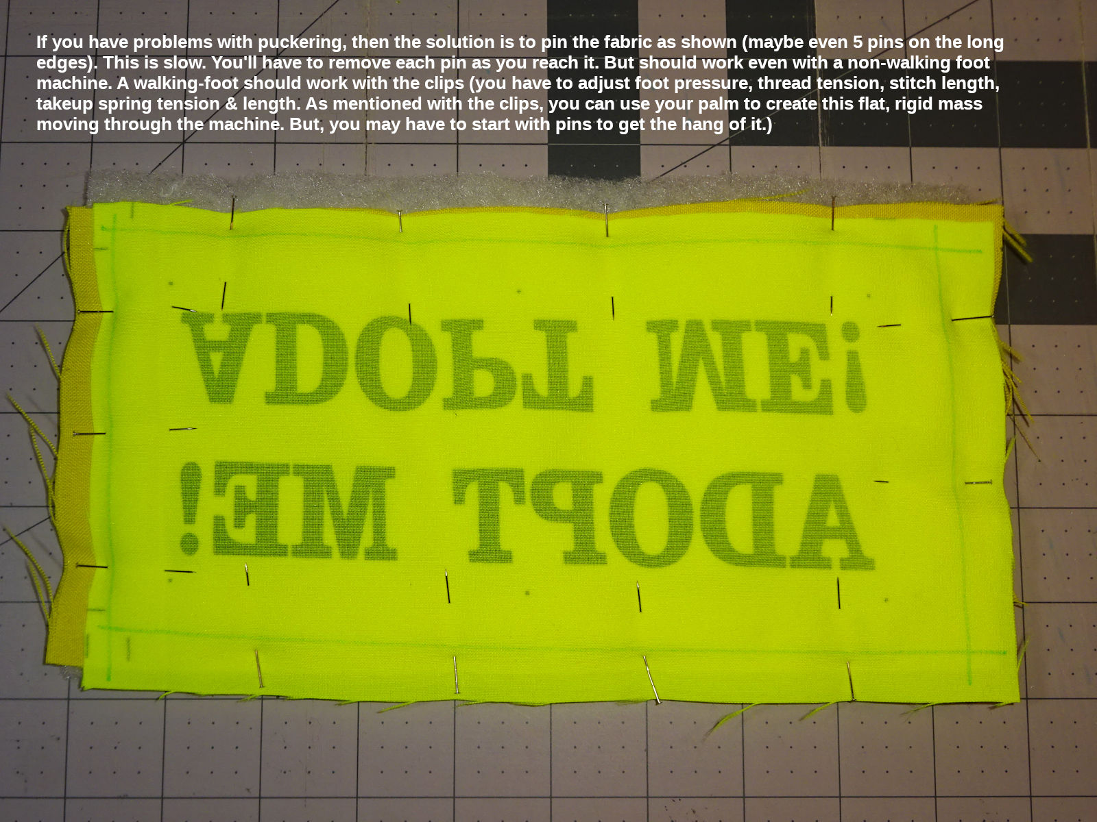 Similarly, it helps if you clip the material so it's taught across the top fabric. I.e., after clipping the material it will be poofy, loose, slack. You can flatten the material with the palm of your hand, and open/close each clip taking the slack out of the material. This makes it easier to do the technique above while sewing (the material will be already flattened).