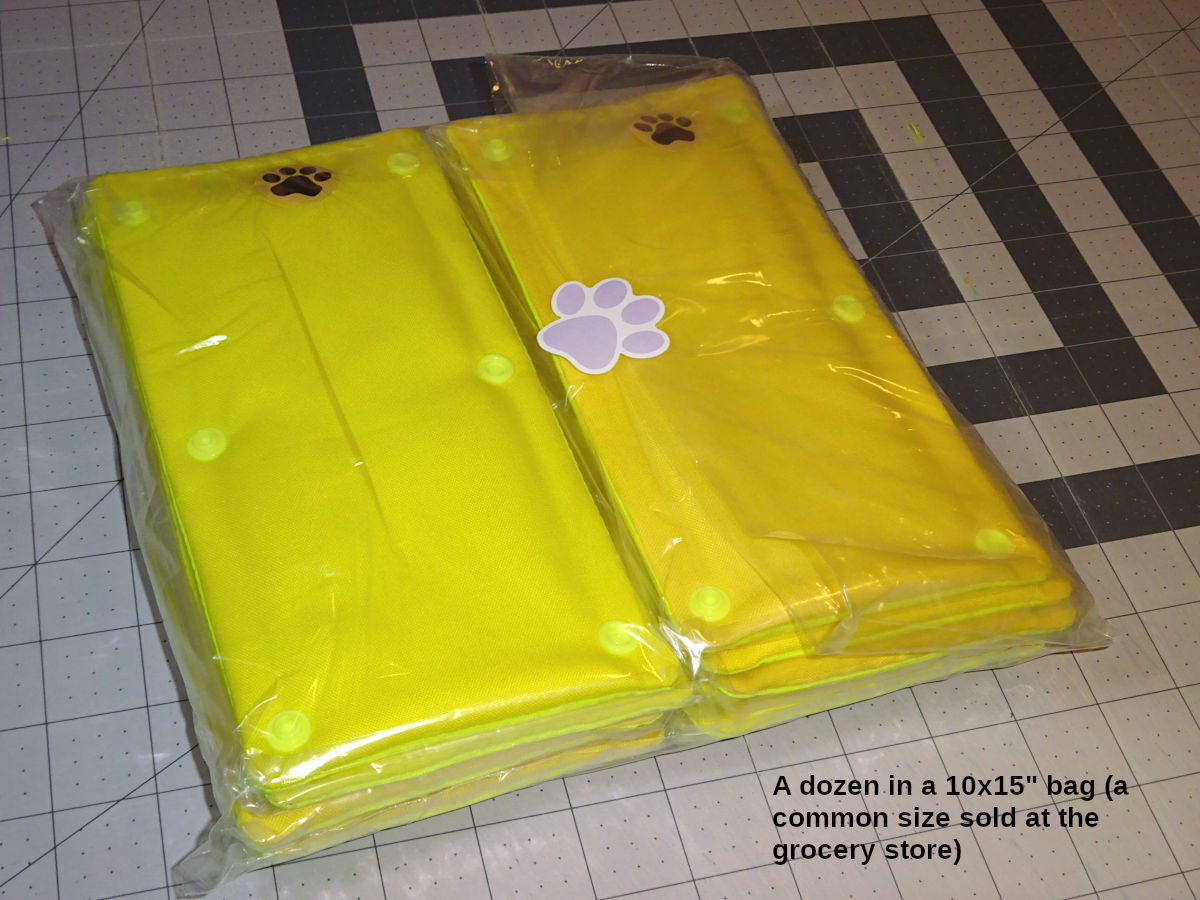 I found 5x10" 1.0mil flat poly bags at a good price. These work well for the sleeves. I close the bag with 1" stickers found on Amazon (paw print). I package a dozen of those into an larger bag:
