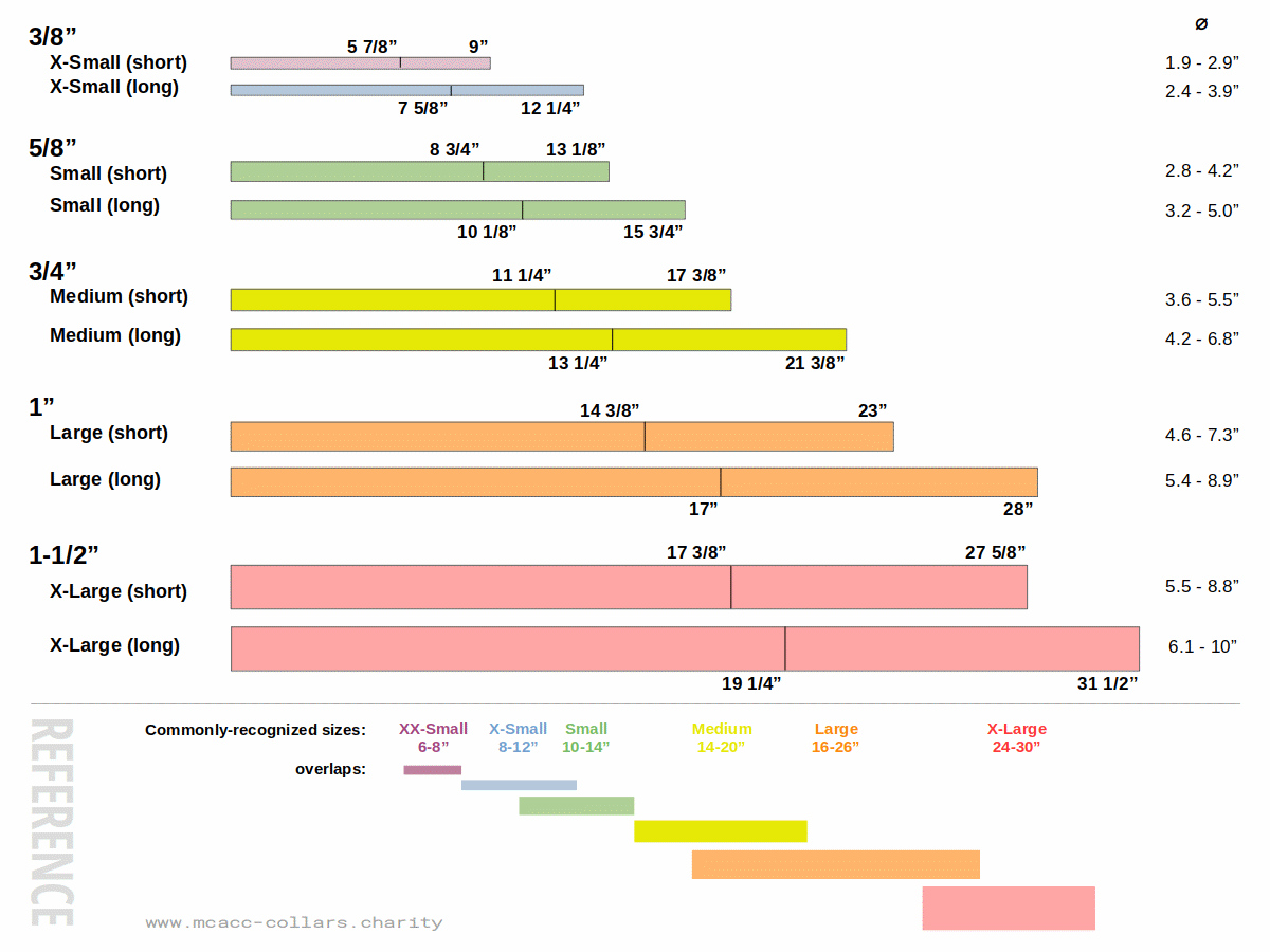 - Canine Journal: Dog Collar, Leash Fit & Sizing Guide (see collar sizes near middle of page) (archived)